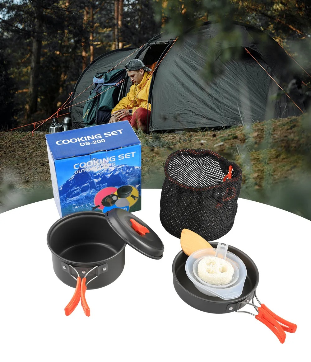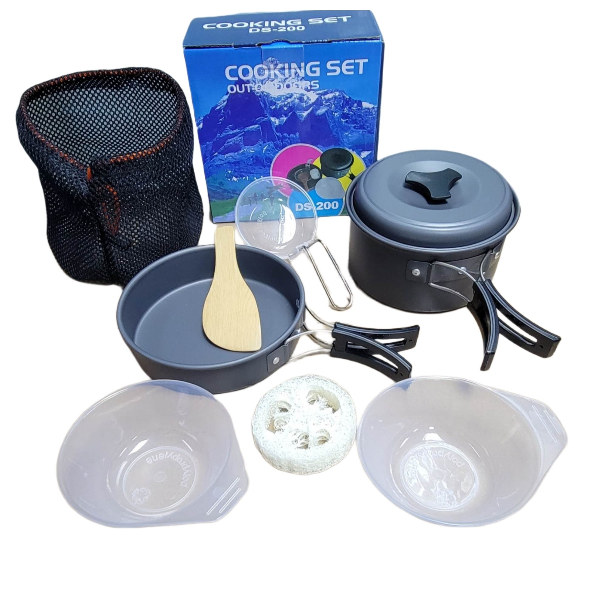 This outdoor cooking set is designed for two or Three people. – The pot and frying pan are made of anodised aluminum, which makes it solid and light. – This cooking set is a kind of non-stick cookware. – There are foldable handles on pot, frying pan. After use, they can be folded to save space. – Small size and portable. And all the objects in this cooking set can be stored together in a mesh bag for convenient carry. – Thoughtful consideration: it is supplied with a loofah sponge to clean these utensils. – It is suitable for camping, hiking, backpacking, picnic and other outdoor activities.