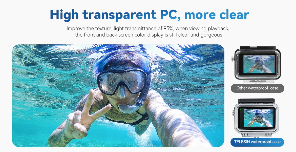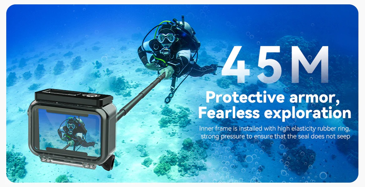 Protect your DJI Action 5,4 3 camera with the TELESIN Waterproof Housing, engineered for extreme underwater adventures and rugged outdoor use. With a precision seal and ultra-clear lens, this case lets you capture stunning footage up to 45 meters (148 feet) underwater—without compromising video quality or camera safety.