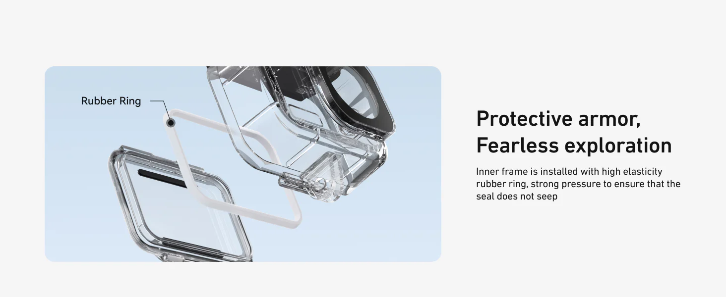 The case features a high-elastic rubber ring inside the frame to maintain a secure, leak-proof seal, ensuring your camera remains dry and safe even under high pressure.