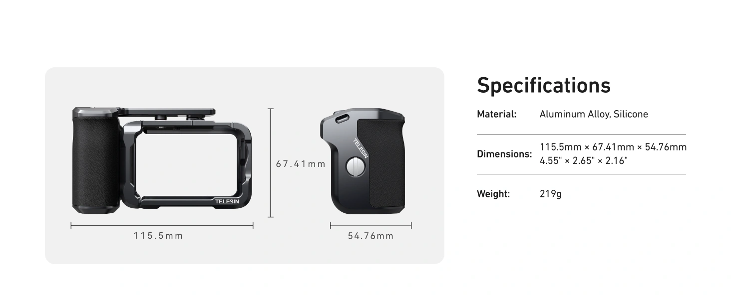 - 【Product List】TELESIN Ultra-Lightweight Camera Cage × 1, Camera Grip Handle × 1, Cold Shoe Button ×1, Wrist Strap × 1, T-Wrench ×1;NOTE:This TELESIN Camera Grip Only Matching TELESIN Ultra-Lightweight Cage To Be Used. Not compatible with other camera cages