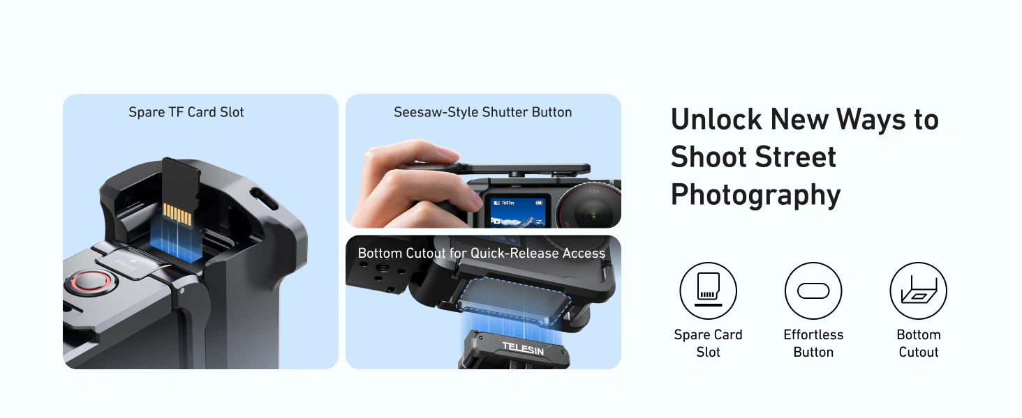 - 【Patented Seesaw Shutter Button】TELESIN camera grip kit replacing hard-press shutter buttons of traditional accessories. Paired with TELESIN-Patented Seesaw Button’s mechanism, it eliminates wasted effort. A light press is all it takes for a crisp, instant shutter response.