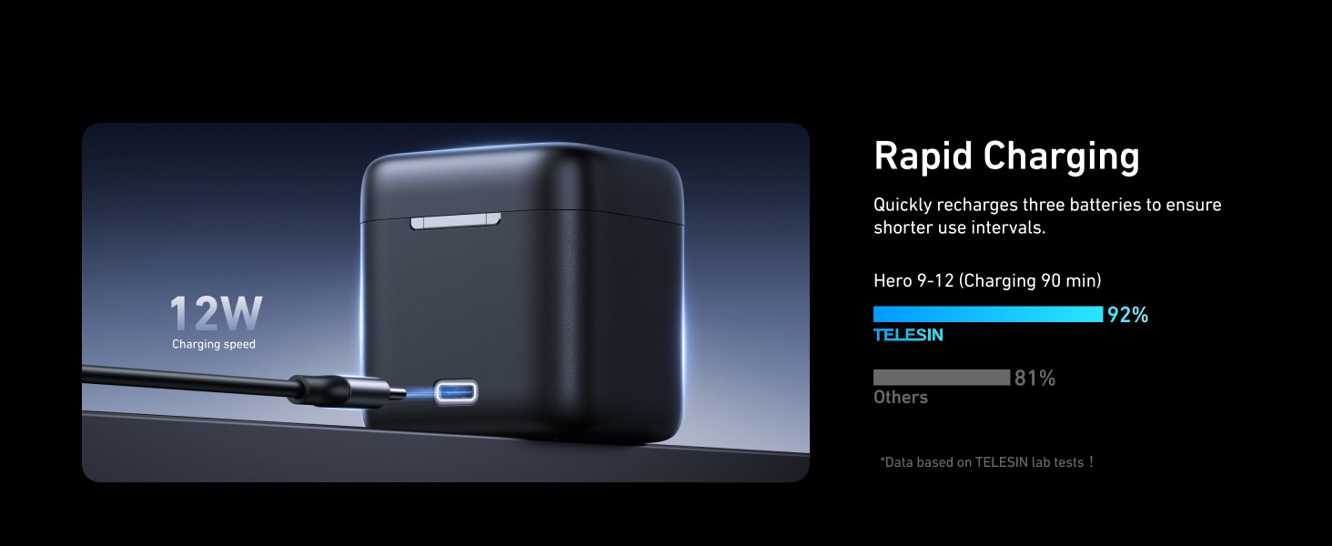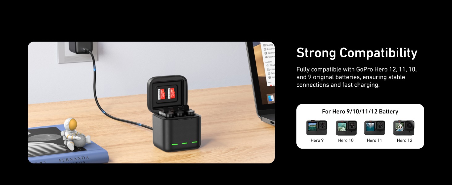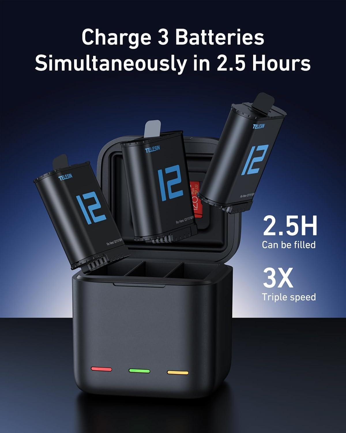 - 【3-Slot Fast Charger for GoPro Hero 12/11/10/9 Batteries】Charge 3 batteries simultaneously in 2 hours using the included USB-C cable. Ideal for multi-day adventures where quick turnaround is essential. Compact design eliminates the need for bulky charging stations.