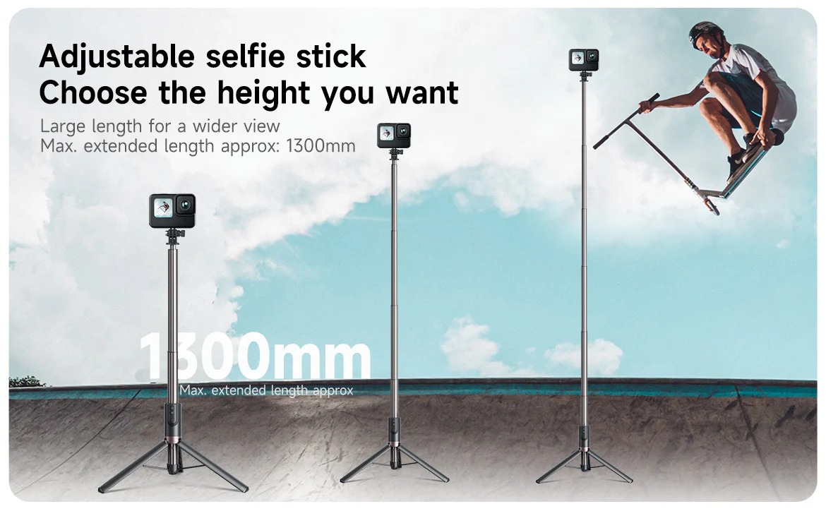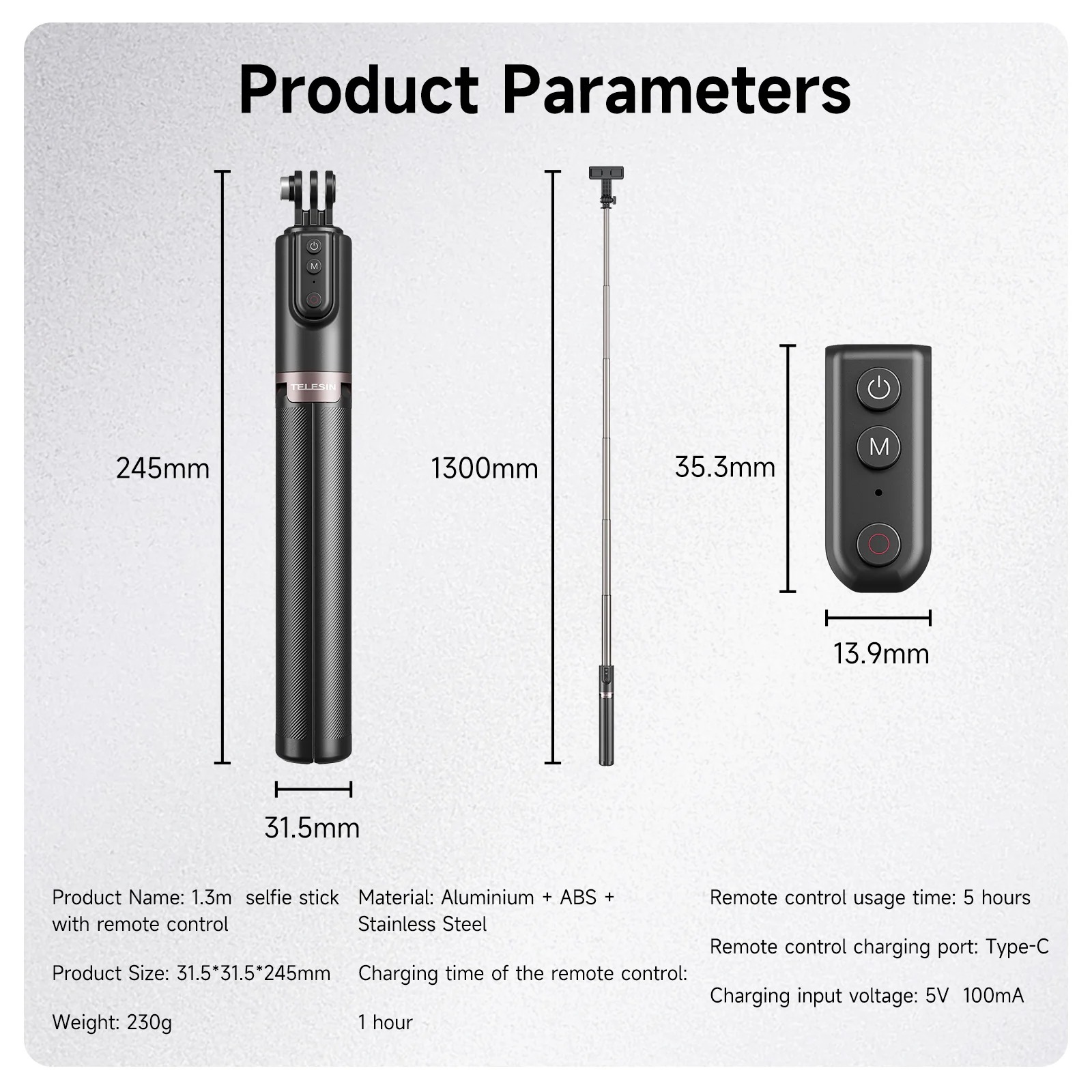 TELESIN Upgraded 1.3m Bluetooth Remote Control Selfie Stick for GoPro/Phone